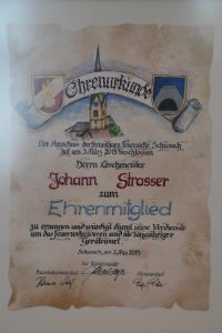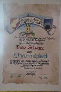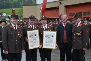 Die Aufstellung vor dem Gerätehaus mit Musikkapelle und Sängerrunde war dann der passende Rahmen, um zwei lang gediente Kameraden auszuzeichnen. Johann Strasser und Franz Schwarz wurden von Kommandant Peter Payr und seinem Stellvertreter Martin Steinbacher zu Ehrenmitgliedern der Wehr ernannt. Strasser steht seit 44 Jahren in den Reihen der Wehr (viele Jahre davon als Gerätewart), Schwarz ist seit 41 Jahren Feuerwehrmann und war 24 Jahre lang Gruppenkommandant der 4. Gruppe und lange Zeit Funkbeauftragter der FF Schwoich.